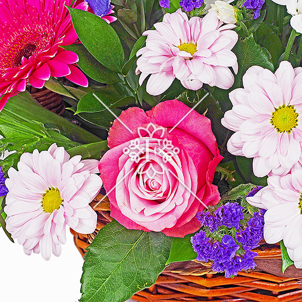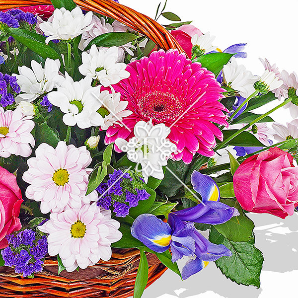 Пушистые шапочки хризантем наполняют корзину желаемым цветочным объемом, а розовые розы и герберы  придают корзине аккуратную нежность. Ирисы и  статица, которые будто только что сорваны с в прекрасном саду, дополняют композицию.